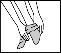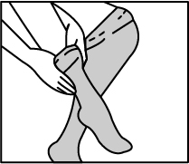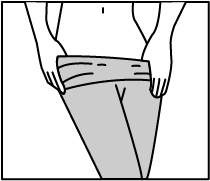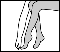 Usando entrambe le mani, raccogliete una gamba del collant sulla punta del piede. Iniziando con il lato destro o sinistro, ( una gamba alla volta ) afferrate il punto vita delle calze e raccogliete delicatamente su se stessa la gamba della calza in modo da esporre la parte interna della punta del piede facilitando l’infilo del piede senza strappare il nylon.